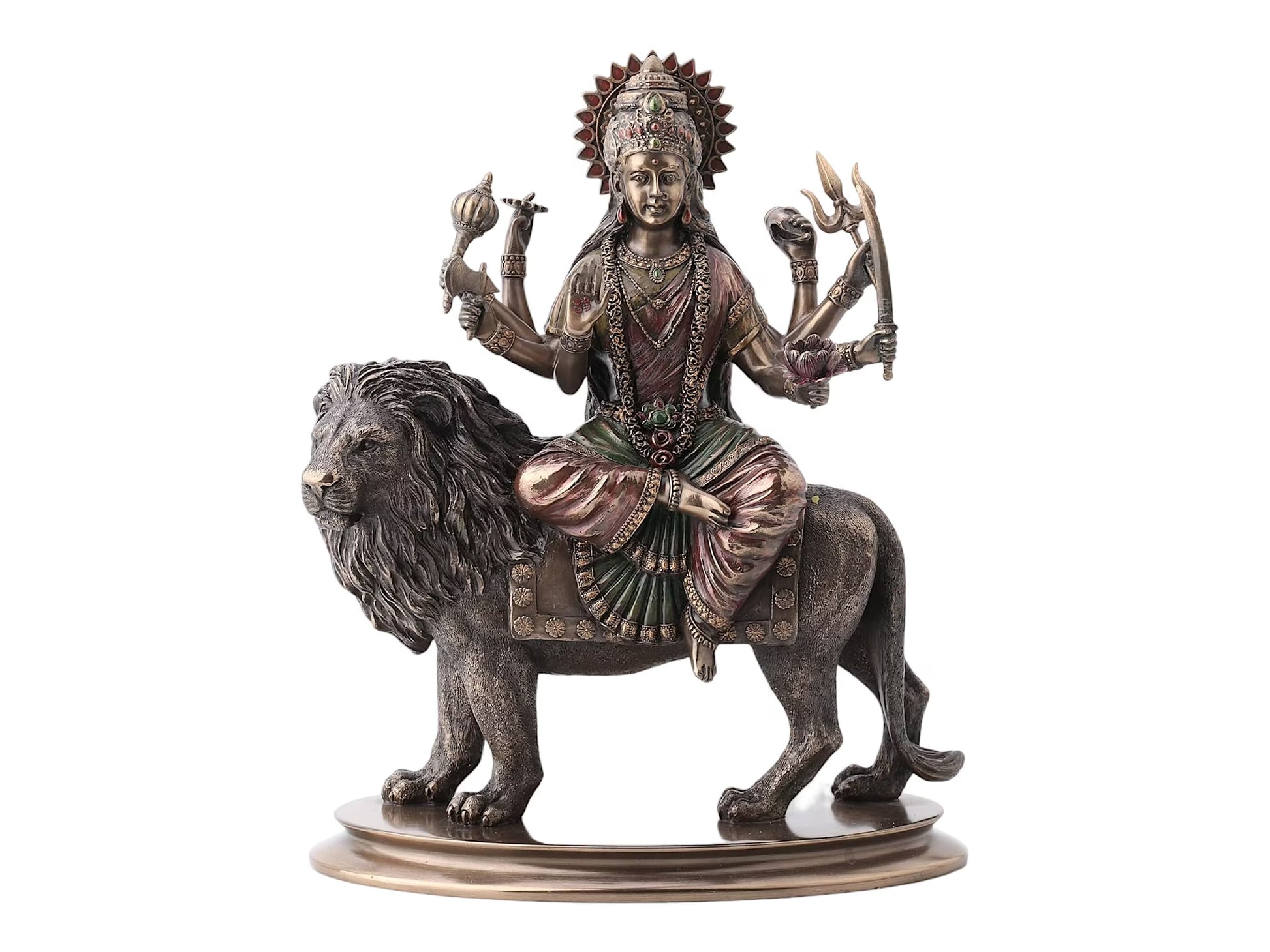 Invite divine strength and protection into your home with this exquisitely crafted Goddess Durga Idol, depicted riding her majestic lion. Designed with intricate detailing and an antique bronze finish, this statue captures the grace and power of Maa Durga, holding her symbolic weapons in multiple hands. Made from premium quality brass-resin blend, it’s perfect for placing in your puja room, living space, or as a centerpiece for festive décor.
