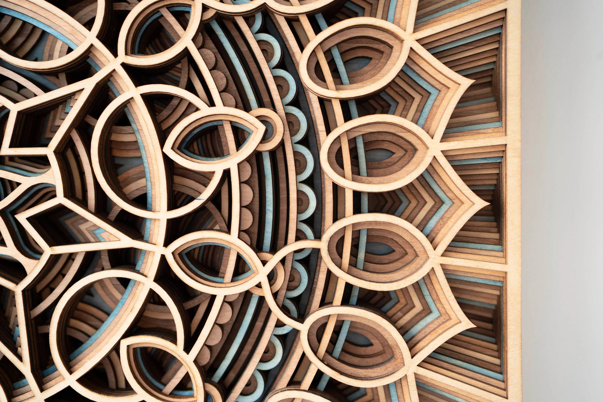 Add a touch of sophistication and serenity to your space with this handcrafted layered wooden mandala wall art. Featuring intricate laser-cut geometric patterns and a harmonious blend of natural wood tones with subtle pops of blue, this piece radiates elegance and balance. Perfect for living rooms, bedrooms, meditation spaces, or offices, it brings warmth and artistic charm to any wall. Made from high-quality wood, each layer is precisely cut and assembled to create a mesmerizing 3D effect that draws the eye and sparks conversation.